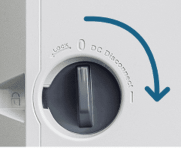 Drehen Sie den runden DC-Trennschalter am Wechselrichter nach links bis er auf 0 steht. (ruhig etwas beherzter drehen, da der Schalter schwergängig geht)