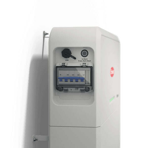 Schalten Sie die Sicherung für den Batteriespeicher am Fronius Reserva aus, indem Sie den Sicherungsschalter unter dem Kunststofffenster an der Seite nach unten drücken. Nachdem die Kontroll-LEDs erloschen sind, warten Sie etwa 5-10 Minuten.